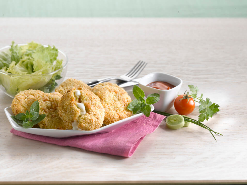 - Gyúrj maximum 5 cm átmérőjű kis golyókat, lapítsd lepényformájúra és hempergesd zsemlemorzsába őket. Extra szűz olívaolajjal kikent tepsiben, 180°C-os sütőben süsd 15 percig.