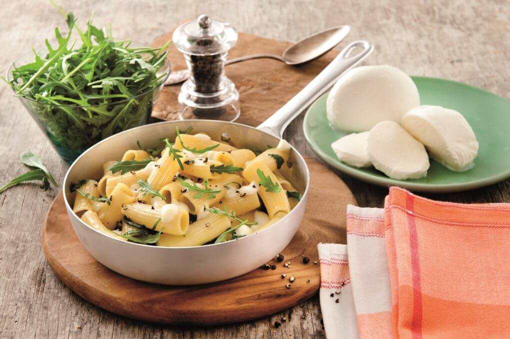6. Szedd ki a tésztát tányérokba, szórd meg az apró kockákra vágott Mozzarella sajttal, frissen őrölt borssal és azonnal tálald.